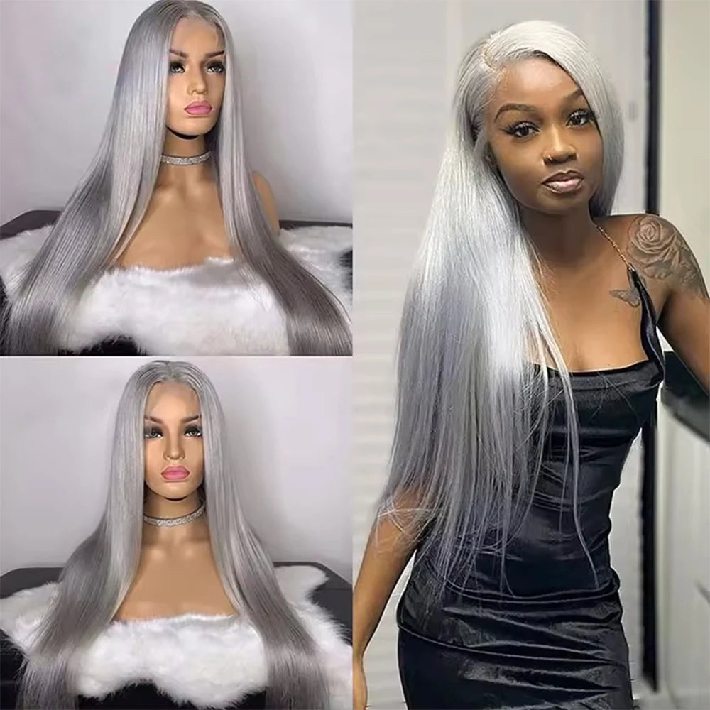 Silver Grey 13x6 HD Lace Front Wig – 100% Brazilian Remy Human Hair, 250% Density, Straight, 30–40 Inch Long, Pre-Plucked Natural Hairline